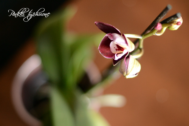 Voitteko kuvitella, mun orkidea kukkii!!!!! Onnenpäivät! Eihän siihen mennytkään kuin kaksi vai kolme vuotta. Näköjään tällä karaistuskasvatusmetodillakin saa kukkia aikaiseksi. Sitkeä sissi tämä orkidean planttu! Tässä nyt pitkin postausta sitten kuvia kukista, ettei varmastikaan jää epäselväksi! :)